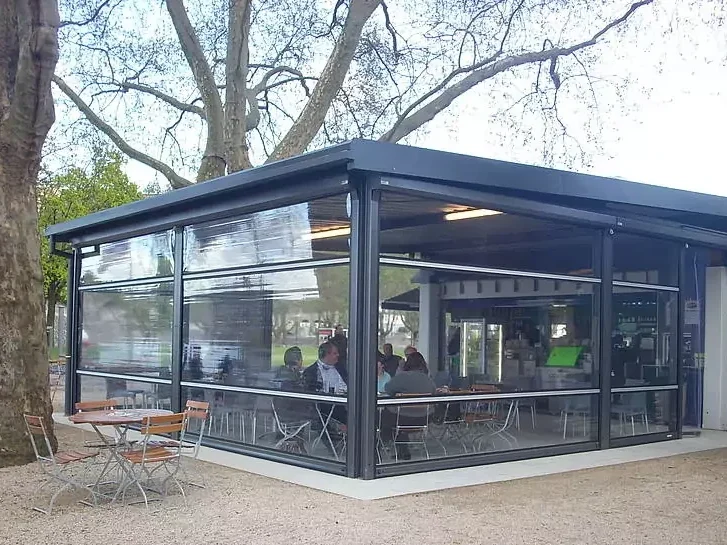 Rollfenster werden vor allem in der Gastronomie eingesetzt, um offene Bereiche flexibel vor Witterungseinflüssen zu schützen und gleichzeitig ihre Offenheit zu bewahren. Sie bieten zuverlässigen Schutz vor Wind, Regen, Kälte und Zugluft und lassen sich je nach Wetterlage stufenlos öffnen oder schließen.
